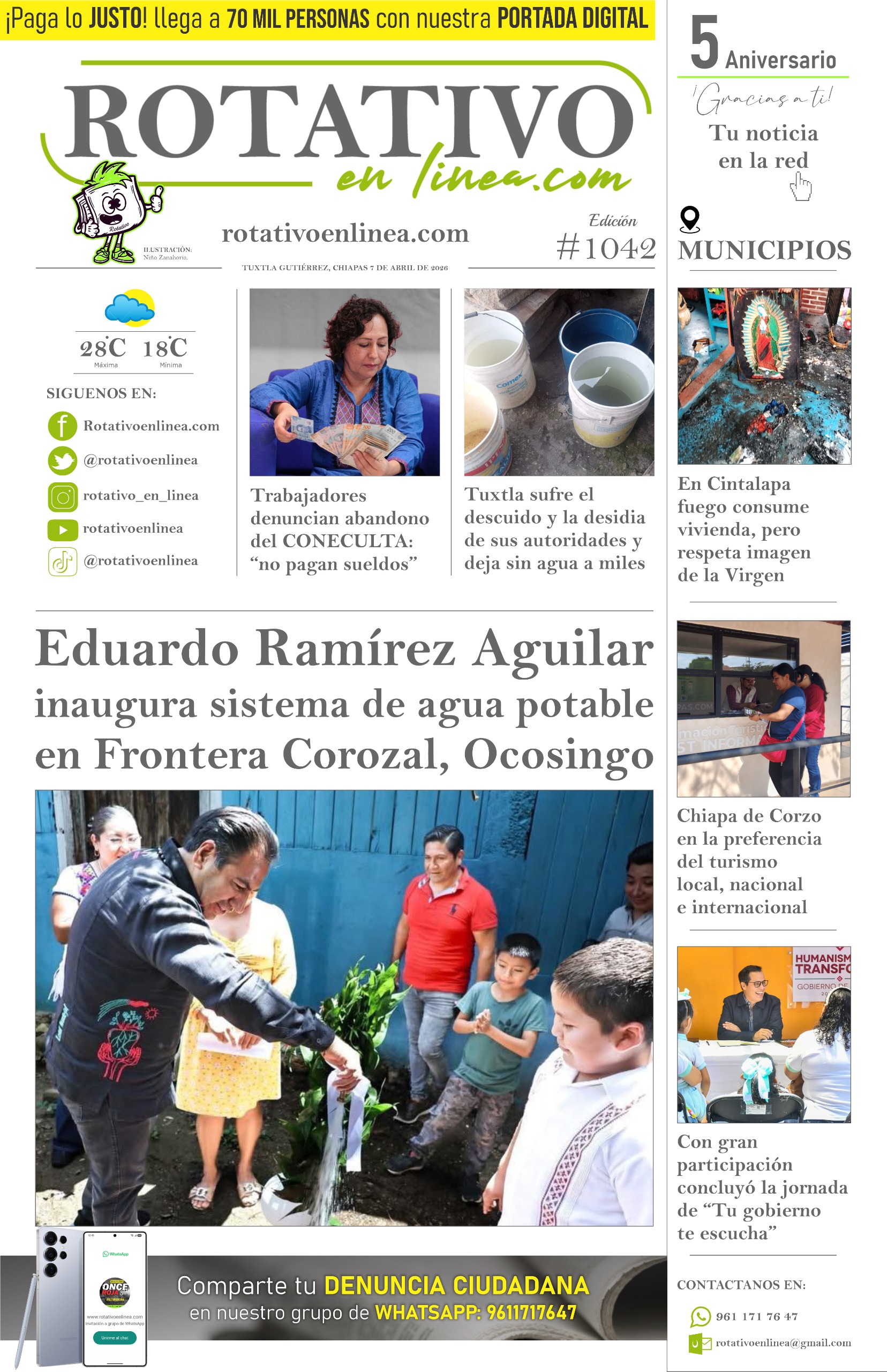 Lekil Kuxlejal, el corazón de la transformación de Chiapas: Luciano Concheiro Más de tres millones se gastó el Coneculta Chiapas en festivales Con Eduardo Ramírez se sembrará la fórmula de una transformación palpable en los 12 municipios: secretario de Educación Salud y Unach signan convenio para mejorar acceso a servicios médicos en los 12 municipios más olvidados Jaime Sabines, centenario con voz y fortuna: Congreso y Lotería Nacional Sector educativo fortalece el enfoque del Buen Vivir en Chiapas Icatech lleva cursos a municipios históricamente olvidados Impulsa secretario de Seguridad del Pueblo 2ª edición de publicaciones de la SSP Más de dos mil personas reciben apoyos auditivos y visuales gracias al trabajo en territorio del Instituto de Beneficencia Pública Fortalece IMSS Chiapas captación de sangre para cirugías en el Soconusco