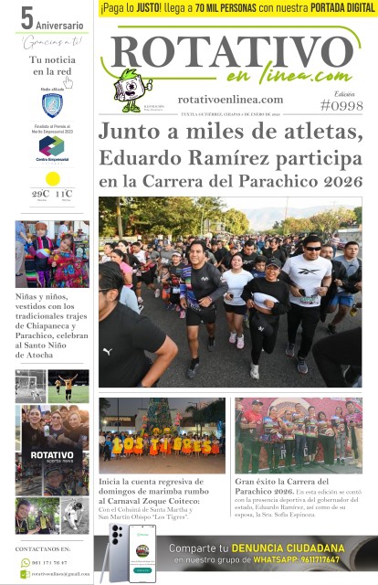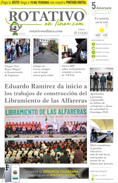 Escuchar para incluir: se construye la corresponsabilidad de la comunidad educativa Innovación que Transforma: tecnología al servicio del Buen Vivir educativo Promueve IMSS Chiapas escucha empática para fortalecer la salud mental Atiende IMSS Chiapas primer nacimiento de 2026 en el estado Hacia una vida libre de violencia: Compromisos educativos del primer año de la Nueva ERA IMSS Bienestar fortalece la atención quirúrgica en la región Soconusco con jornadas en Tapachula Delegado del Bienestar en Chiapas lucra con necesidades del pueblo, denuncian Con disciplina fiscal y sin deuda, la Secretaría de Finanzas marca rumbo en Chiapas Padre dona un riñón a su hijo en exitoso trasplante renal realizado por el IMSS Bienestar en Chiapas Coneculta realiza entrega de libros del programa Leyendo por la paz