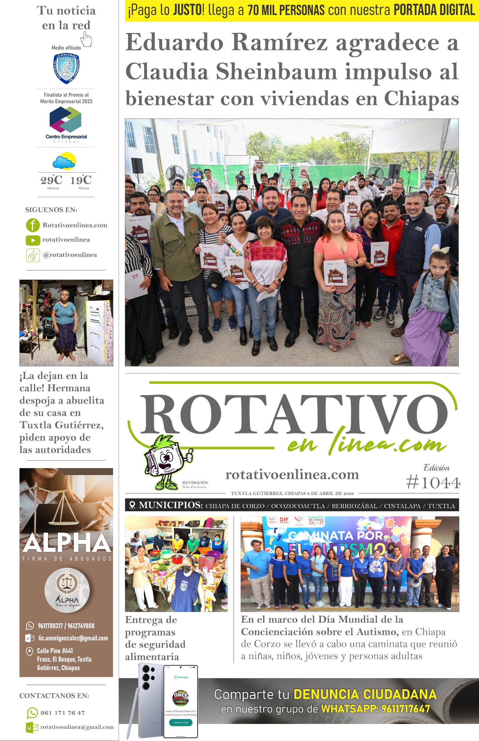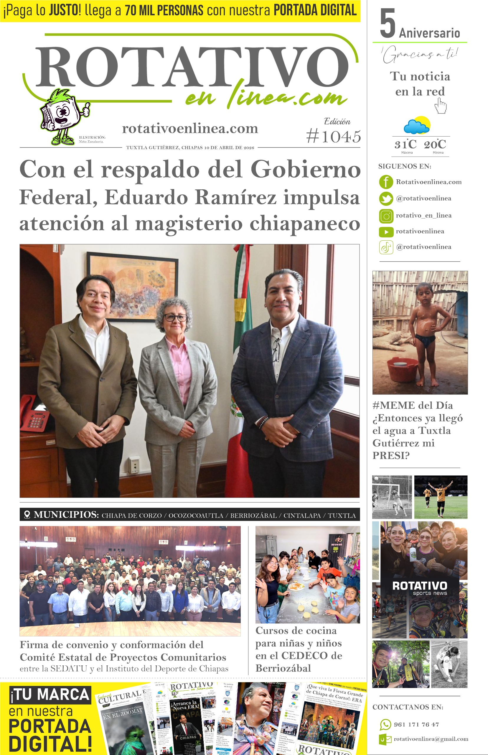 Chiapas amplía plazo del programa “Borrón y Cuenta Nueva” para motocicletas Viridiana Figueroa García reafirma transparencia en el Cobach Investigadores internacionales estudiarán al Programa de Alfabetización “Chiapas Puede” Trabajadores denuncian abandono del CONECULTA Chiapas: “no pagan sueldos” Aditech fortalece la conectividad y seguridad de vacacionistas con Internet itinerante en ríos de Chiapas Lekil Kuxlejal, el corazón de la transformación de Chiapas: Luciano Concheiro Protección Civil de Chiapas mantiene vigilancia permanente con el operativo Semana Santa Segura Fuego consume vivienda, pero respeta imagen de la Virgen Más de tres millones se gastó el Coneculta Chiapas en festivales Con Eduardo Ramírez se sembrará la fórmula de una transformación palpable en los 12 municipios: secretario de Educación