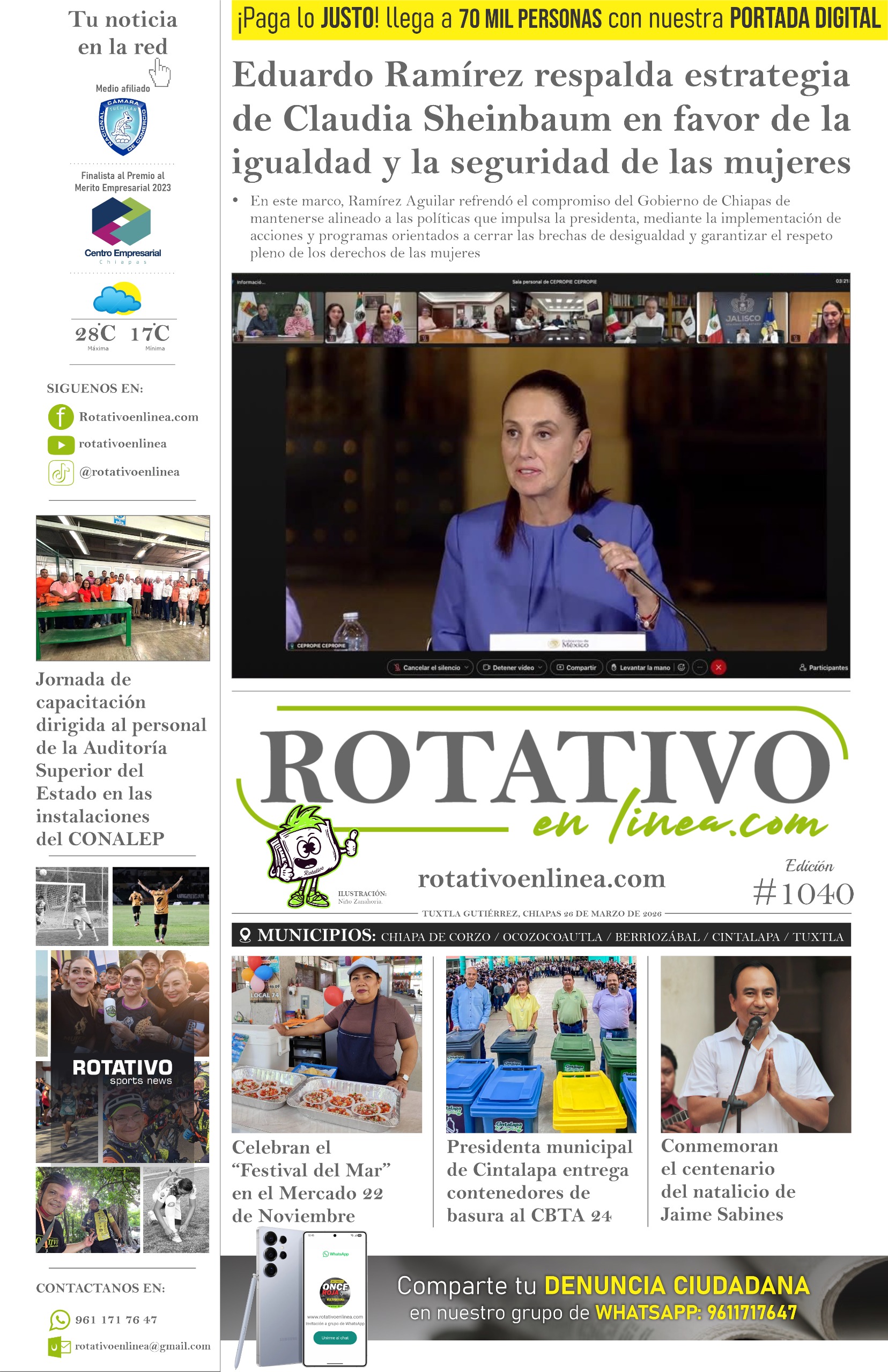 26 de marzo de 2026. Eduardo Ramírez respalda estrategia de Claudia Sheinbaum en favor de la igualdad y la seguridad de las mujeres