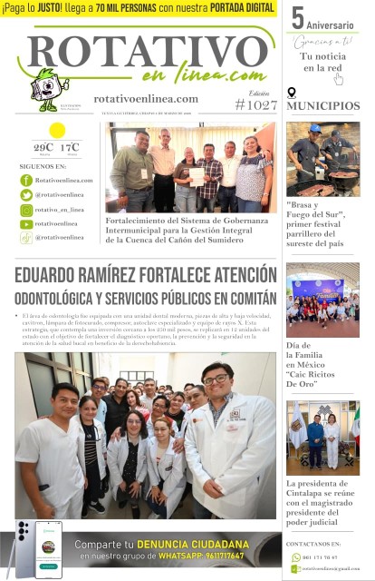 Impulsa Icatech plan de acción enfocado en los 12 municipios prioritarios de Chiapas México y Guatemala fortalecen acciones de vacunación ante riesgo de sarampión en la región fronteriza Inauguran domo en el Cecyt 35 El Malé en beneficio de la comunidad estudiantil Entre la palabra y la comunidad: psicoanálisis y Lekil Kuxlejal convergen en el Congreso Se presentó “Cuentos jeringonzos y otras hormigas” de Raymundo Zenteno Eduardo Ramírez dio el banderazo de arranque de la Súper Copa Roshfrans 2026 Gobernador Eduardo Ramírez Aguilar impone medalla “Ángel Albino Corzo Castillejo” a Florentino Pérez Refuerzan coordinación para obras educativas en Chiapas Esperan comercios de Canaco Tuxtla repunte en ventas para Semana Santa Eduardo Ramírez Aguilar y Juan Carlos Moreno Guillén atestiguan sesión histórica de la SCJN en Tenejapa, Chiapas