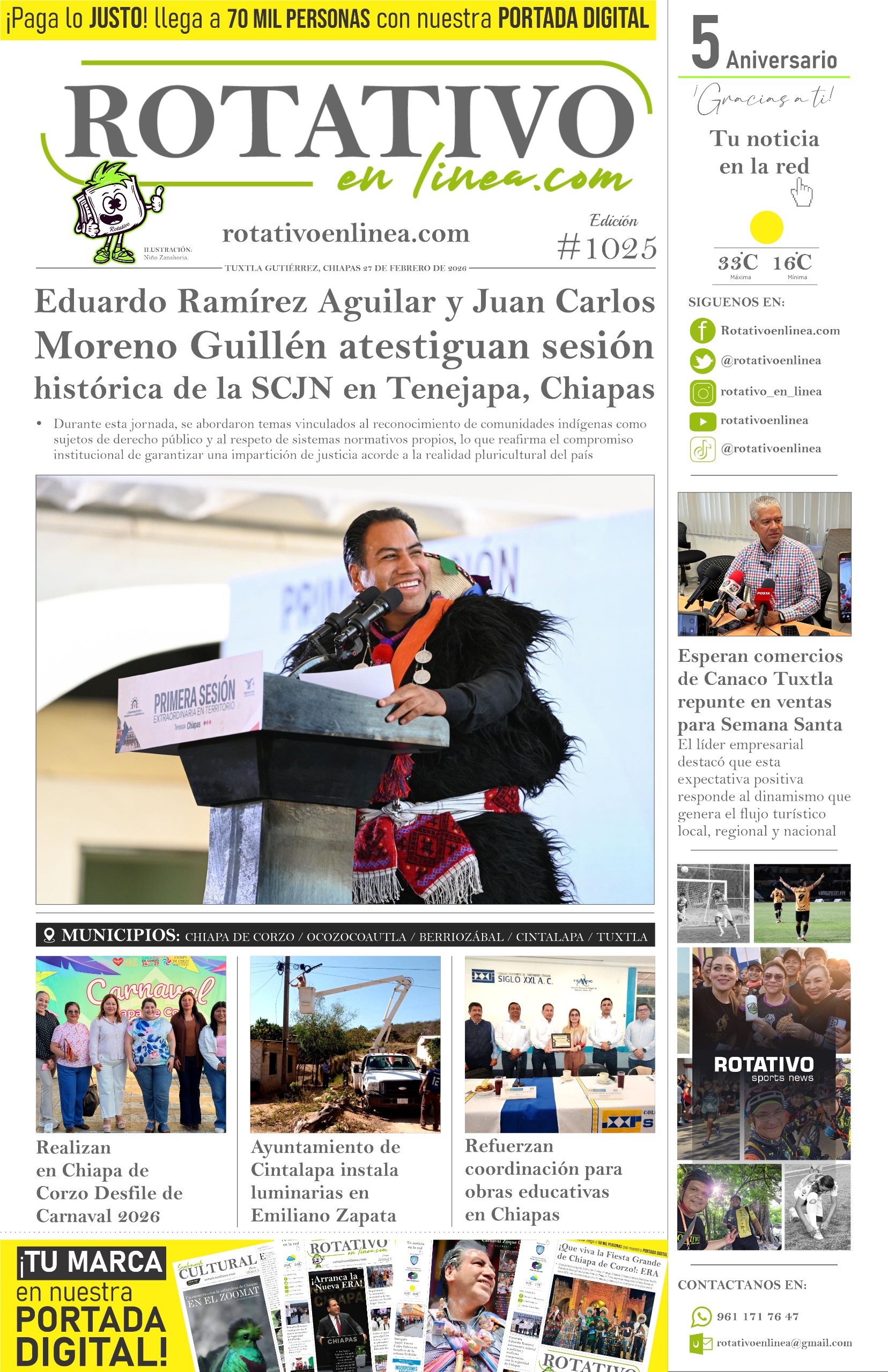 Realiza IMSS Chiapas reconstrucciones mamarias en Tapachula y evita traslados a otros estados Cecytech promueve entornos escolares seguros a través de estrategias preventivas Estudiantes de Reforma se suman al movimiento “Vive saludable, vive feliz” Cecyt 05 impulsa jornada de limpieza y convivencia juvenil Bandera: compromiso, responsabilidad y amor por México desde la educación Eduardo Ramírez encabeza presentación del Programa de Restauración y Saneamiento de Microcuencas de la Nueva ERA Presenta SSP Mandos Únicos en Cintalapa de Figueroa y Ocozocoautla de Espinosa Instituciones educativas consolidan acuerdos por la vanguardia tecnológica en Chiapas Chiapas fortalece su promoción turística en Puebla Cecytech y CEPSVyPC firman convenio para fortalecer la cultura de paz en Chiapas
