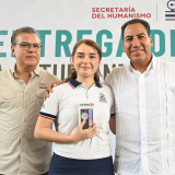 Junto al secretario del Humanismo, Paco Chacón, entregó bicicletas a estudiantes de la Escuela Secundaria Técnica 64 de Tuxtla Gutiérrez.