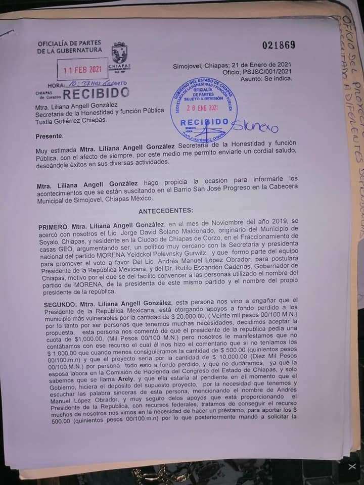El abogado Dagoberto Daniel Domínguez Vázquez en representación de un grupo de 185 personas del poblado San José del municipio de Simojovel, presentó la formal denuncia en contra de Jorge David Solano, pseudo gestor de proyectos oriundo del municipio de Soyaló quien utiliza el nombre del programa “Bienestar” para cometer sus fechorías.