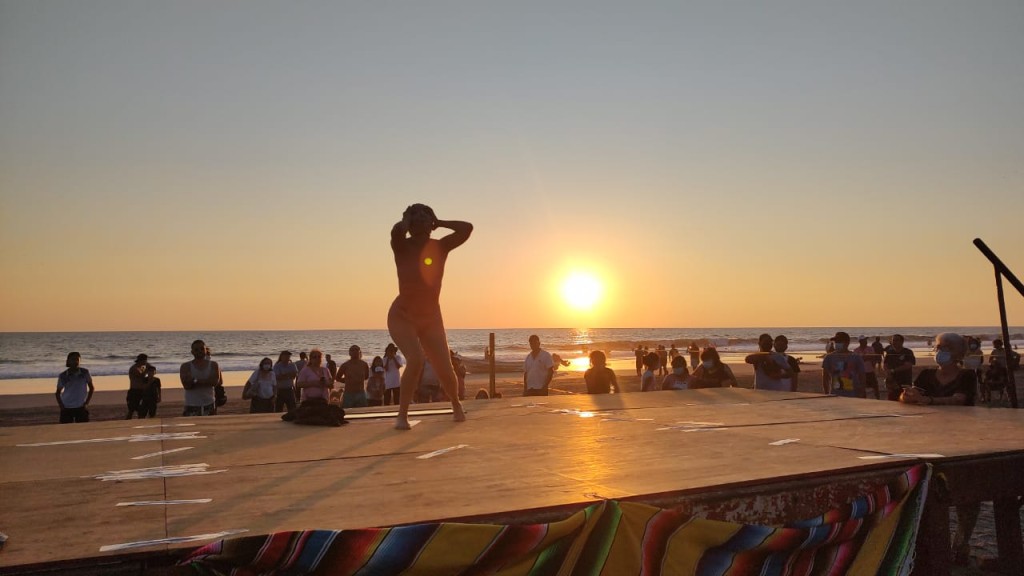 Para los turistas locales, nacionales e internacionales, la presentación de Jazmín Zea Ruiz con danza contemporánea en el Andador de la Tortuga, en el marco del primer “Encuentro Cultural en Puerto Arista” convocado por la Casa de las Artes y el Mar, Coneculta, fue un momento especial matizado por el mar, la brisa y un atardecer espectacular.