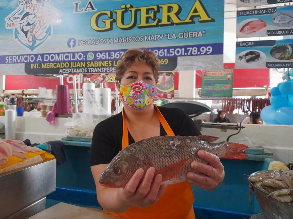 A Doña Mary la encuentras en el interior del Mercado Juan Sabines, en el área de pescados y mariscos frescos, en el local 368 y 369, de lunes a domingo, con horario de 7:00 de la mañana a 5:00 de la tarde, además agrega un número de teléfono para hacer sus encargos al 961 367 16 78, ofreciendo al público en general: jaibón, guachinango, robalo, lisa, mojarra blanca y negra tilapia, calamar, surimi para coctel, preparado para coctel, macabil y filete.