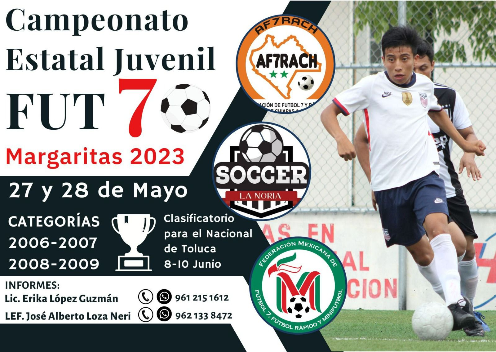 Erika López Guzmán, presidenta de la AF7RACH informó que en el mes de junio (del 8 al 10) se llevará a cabo el Campeonato Nacional Juvenil de Fut 7 en Toluca, Estado de México, razón por la cual se está organizando este selectivo estatal en el municipio de Las Margaritas, Chiapas.
