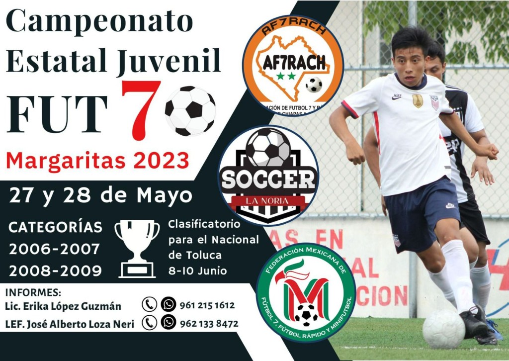 Muy pronto sonará el silbatazo inicial para el Campeonato Estatal Juvenil de Fut 7 “Las Margaritas 2023”, a celebrarse en las espectaculares instalaciones de La Noria Soccer; el campeonato tendrá lugar los días 27 y 28 de mayo en el mencionado municipio de Las Margaritas y cuenta con el aval de la Asociación de Futbol 7 y Rápido de Chiapas (AF7RACH), así como de la Federación Mexicana de Futbol 7, Futbol Rápido y Mini Futbol.