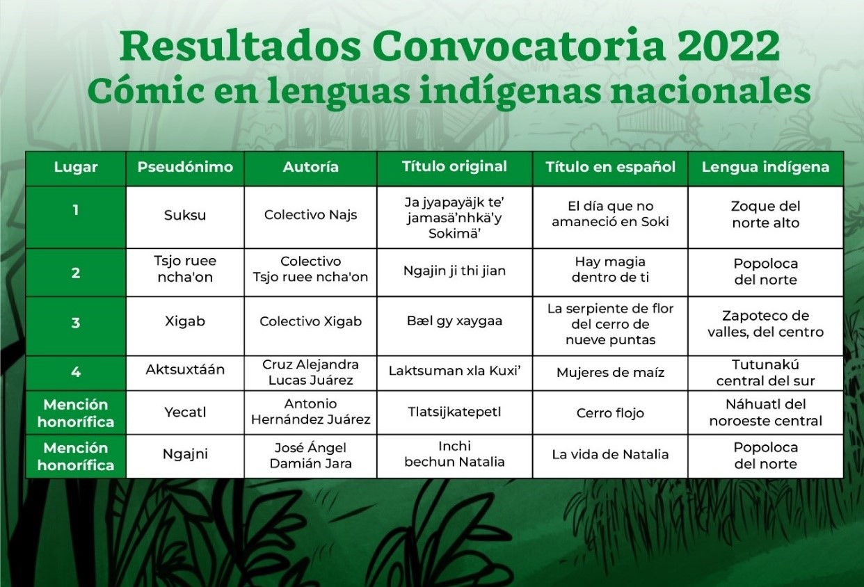 Se trata de las cuatro obras ganadoras de la más reciente edición de la Convocatoria Cómic en lenguas indígenas nacionales, que tiene el objetivo de promover el multilingüismo de la nación mexicana y el uso de las lenguas indígenas nacionales en la creación de obras de géneros literarios novedosos y actuales que abonen al fortalecimiento de la diversidad lingüística del país.