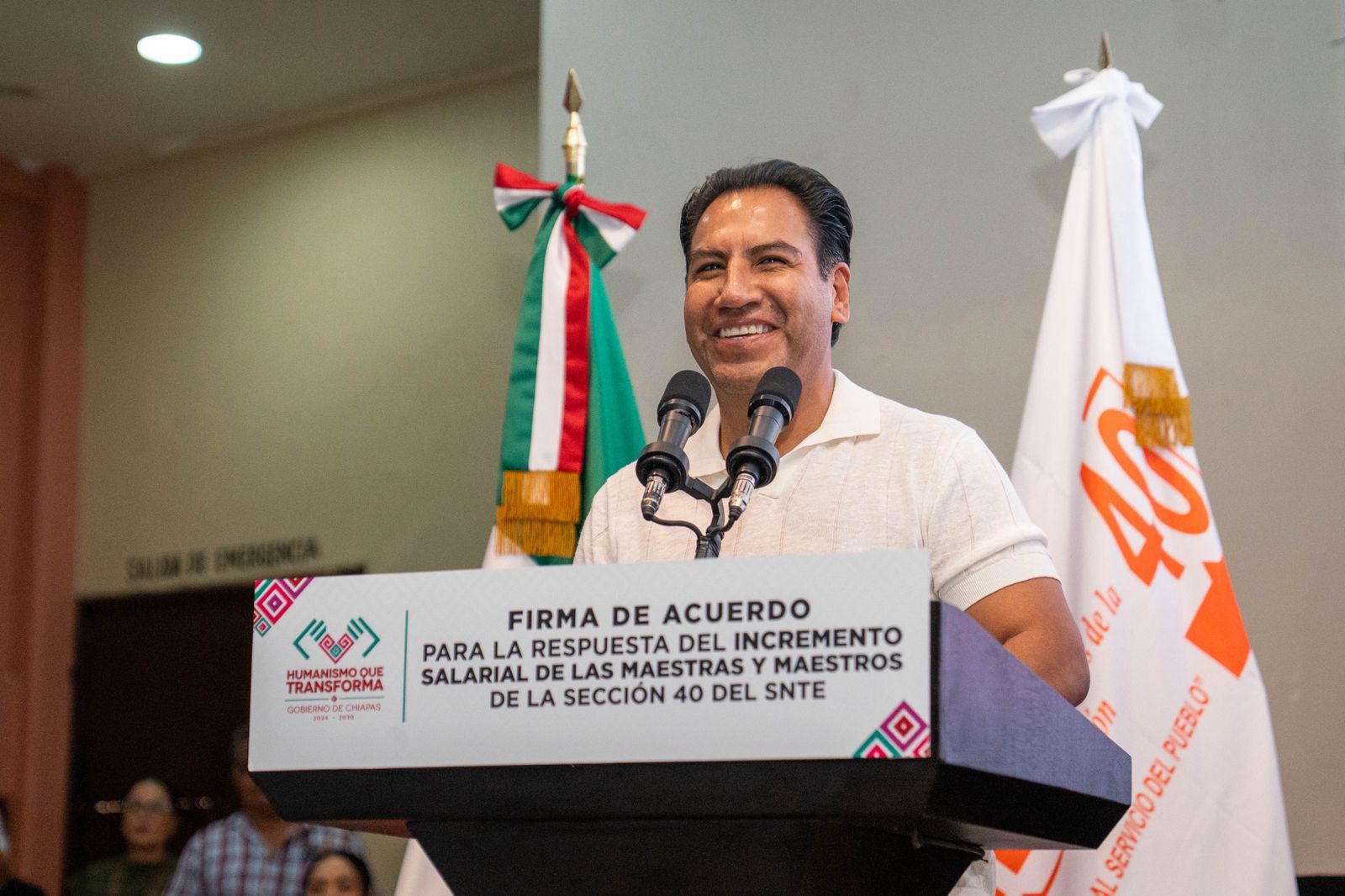 El gobernador Eduardo Ramírez Aguilar participó en la Firma de Acuerdo para la Respuesta del Incremento Salarial a Maestras y Maestros de la Sección 40 del Sindicato Nacional de Trabajadores de la Educación (SNTE). En este marco, subrayó que, además de un acto de justicia laboral, representa un reconocimiento a la vocación y al papel fundamental que desempeñan en favor de la educación y el desarrollo de Chiapas.