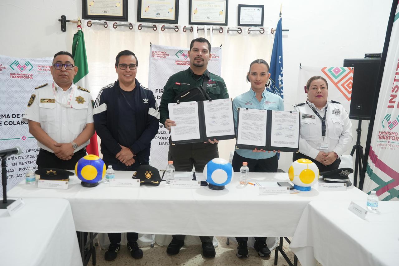 El secretario de Seguridad del Pueblo, Óscar Alberto Aparicio Avendaño, y la directora general del Instituto del Deporte del Estado de Chiapas (Indeporte), Bárbara Altúzar, firmaron un Convenio de Colaboración Interinstitucional en el Centro de Internamiento Especializado para Adolescentes (CIEA) “Villa Crisol”, acompañados del subsecretario de Ejecución de Sanciones Penales y Medidas de Seguridad, Zeín Jerónimo Gil y del presidente municipal de Berriozábal, Jorge Acero, con el objetivo de fortalecer las actividades físicas y deportivas como parte fundamental del proceso de reinserción social.