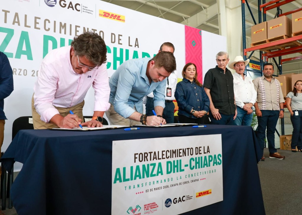 Desde las instalaciones del Aeropuerto Internacional Ángel Albino Corzo, y con el objetivo de consolidar la red nacional de carga, favoreciendo el flujo ágil y eficiente de mercancías entre el centro y el sureste del país, este martes el secretario de Economía y del Trabajo (SEyT) de Chiapas, Luis Pedrero González, en representación del gobernador Eduardo Ramírez Aguilar, encabezó la firma del Convenio de Colaboración con la empresa DHL Express México.
