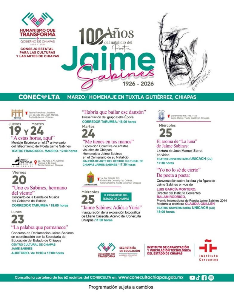 El Gobierno del Estado, a través del Consejo Estatal para las Culturas y las Artes de Chiapas (Coneculta), en conjunto con la familia del poeta mayor, conmemorará del 19 al 25 de marzo el centenario del natalicio de Jaime Sabines Gutiérrez (1926-2026).