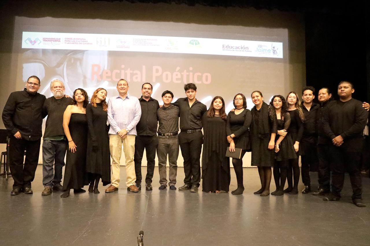 El Consejo Estatal para las Culturas y las Artes (Coneculta), en coordinación con el Colegio de Estudios Científicos y Tecnológicos del Estado de Chiapas (Cecytech), presentaron el recital escénico “A estas horas, aquí”, en el Teatro Francisco I. Madero, en el marco del centenario del natalicio del poeta Jaime Sabines Gutiérrez (1926-2026).