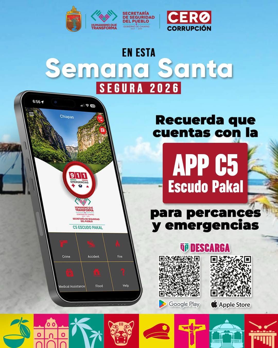 Con el objetivo de garantizar unas vacaciones seguras en todo el territorio chiapaneco durante la Semana Santa, el secretario de Seguridad del Pueblo, Óscar Alberto Aparicio Avendaño, exhortó a la población local y a visitantes a descargar la aplicación móvil gratuita C5 Escudo Pakal, para atender de manera inmediata cualquier emergencia o situación de riesgo.